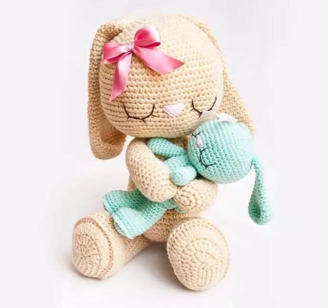 Assembly Sew the ears to the head. You can position them in two different ways, as shown in the photos. Embroider closed eyes using black thread. Embroider the nose with pink thread. Sew the arms to the body. Attach the head to the body. Decorate your bunny as desired.