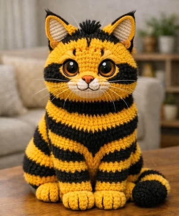 3. Paws (4 Pieces) Start with yellow at the tips, adding stripes as you go up. MR: 6 sc 6 inc (12) (1 sc, 1 inc) * 6 (18) 4.-6. 18 sc (to form the paw shape) (4 sc, 1 dec) * 3 (15) 8-15. Sc in each st, making stripes. 4. Ears (Outer: Black, Inner: White/Cream) MR: 4 sc (1 sc, 1 inc) * 2 (6) (2 sc, 1 inc) * 2 (8) (3 sc, 1 inc) * 2 (10) (4 sc, 1 inc) * 2 (12) (5 sc, 1 inc) * 2 (14) ????️ Assembly and Details Eye Sockets: After attaching the eyes, pull the yarn slightly from the back of the head to the eye corners to create a "sunken" look. This gives the cat its innocent expression. Muzzle: You can crochet two small balls (cheeks) using cream yarn or simply embroider the muzzle. Don't forget the pink nose! Sewing: Sew the head to the body first. Then, pin the paws to the bottom and sides of the body so the cat sits balanced before sewing. Hair: For the black "hair" detail on top of the head, loop small pieces of yarn through the stitches, knot them, and brush them out.