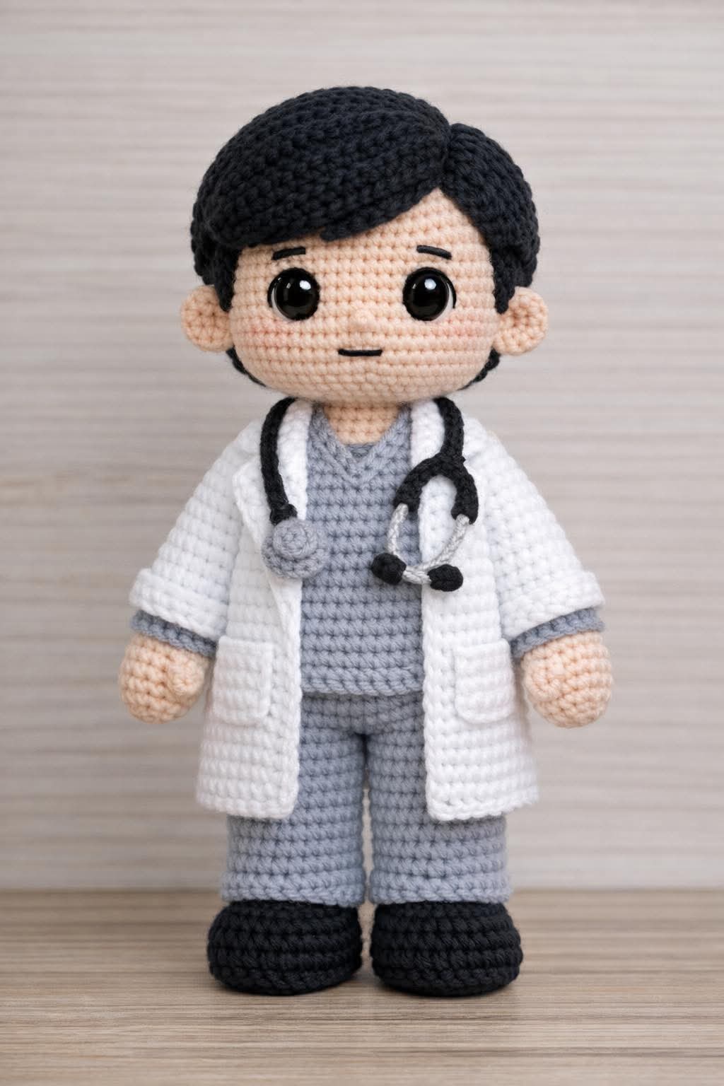 AMIGURUMI DOCTOR Size: Approx. 20–23 cm Materials Yarn: Cotton DK / 8-ply (Colors: A - Skin, B - Light Grey for scrubs, C - White for lab coat, D - Black for shoes/stethoscope, E - Medium Grey for stethoscope chest piece) Hook Size: 2.5 mm (or size needed for a tight tension) Safety Eyes: 10–12 mm Other: Fiberfill, stitch marker, yarn needle, scissors, (Optional: pipe cleaner/wire for the stethoscope) Abbreviations (US Terms) MR: Magic Ring sc: Single crochet inc: Increase (2 sc in one stitch) inv dec: Invisible decrease ch: Chain sl st: Slip stitch st(s): Stitch(es) [ ]: Total number of stitches in the round ( )xN: Repeat the sequence N times 1) HEAD (Color A – Skin) R1: 6 sc in MR [6] R2: 6 inc [12] R3: (1 sc, inc) x6 [18] R4: (2 sc, inc) x6 [24] R5: (3 sc, inc) x6 [30] R6: (4 sc, inc) x6 [36] R7: (5 sc, inc) x6 [42] R8: (6 sc, inc) x6 [48] R9–R16: 48 sc (8 rounds) [48] Eyes: Place between R12 and R13, 8 stitches apart (leave 4 "nose" stitches in the center). Eyebrows: Embroider a short, slightly arched line in black above each eye. R17: (6 sc, inv dec) x6 [42] R18: (5 sc, inv dec) x6 [36] R19: (4 sc, inv dec) x6 [30] R20: (3 sc, inv dec) x6 [24] R21: (2 sc, inv dec) x6 [18] Stuff firmly. R22: (1 sc, inv dec) x6 [12] R23: 6 inv dec [6] Fasten off. (Leave a tail for the mouth or hide the yarn). Mouth: Embroider a small straight line for a serious look or a slight curve.