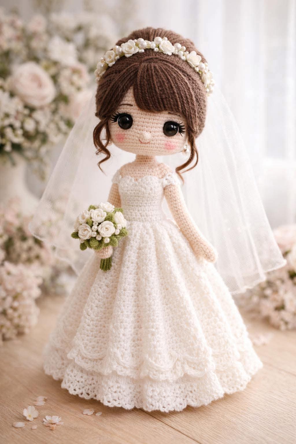 ???? PATRÓN AMIGURUMI Muñeca “Novia Elegante Isabella” Altura final: 28–30 cm Nivel: básico–intermedio Estilo: kawaii elegante + acabado premium ✦ MATERIALES • Hilo DK: • piel • blanco / marfil (vestido) • beige / marrón (cabello) • verde (ramo) • Gancho 2.25–2.5 mm • Ojos 10–12 mm • Relleno • Tul fino (opcional velo) • Hilo bordado ⸻ ✦ ABREVIATURAS AM, pb, aum, dism, cad, pe, mpa FLO / BLO ⸻ ???? 1. CABEZA 1. 6 pb AM = 6 2. 6 aum = 12 3. (1 pb, aum) x6 = 18 4. (2 pb, aum) x6 = 24 5. (3 pb, aum) x6 = 30 6. (4 pb, aum) x6 = 36 7. (5 pb, aum) x6 = 42 8. (6 pb, aum) x6 = 48 9–18. 48 pb 9. (6 pb, dism) x6 = 42 10. 42 pb 11. (5 pb, dism) x6 = 36 12. (4 pb, dism) x6 = 30 13. (3 pb, dism) x6 = 24 ???? Ojos: V14–15 (9 pts separación) 24. (2 pb, dism) x6 = 18 25. (1 pb, dism) x6 = 12 26. 6 dism = 6 ⸻ ???? 2. PIERNAS (x2) 1. 6 pb AM 2. 6 aum = 12 3. (1 pb, aum) x6 = 18 4–6. 18 pb 4. BLO 18 pb 8–20. 18 pb ⸻ ???? 3. CUERPO Unir con 3 cad = 42 pb 1–3. 42 pb 4. (5 pb, dism) x6 = 36 5–6. 36 pb 7. (4 pb, dism) x6 = 30 8–9. 30 pb 10. (3 pb, dism) x6 = 24 ⸻ ???? 4. TORSO 1. (3 pb, aum) x6 = 30 2–4. 30 pb 2. (4 pb, aum) x6 = 36 6–9. 36 pb 3. (4 pb, dism) x6 = 30 4. 30 pb 5. (3 pb, dism) x6 = 24 13–14. 24 pb ⸻ ???? 5. BRAZOS (x2) 1. 6 pb AM 2. 6 aum = 12 3–5. 12 pb 3. (4 pb, dism) x2 = 10 7–14. 10 pb 4. doblar → 5 pb ⸻ ???? UBICACIÓN • Ojos: V14–15 • Brazos: V11–12 • Piernas: centradas ⸻ ???? 6. VESTIDO DE NOVIA Parte superior (ajustada) 1. 24 pb 2. 24 pb 3. (2 pb, aum) x8 = 32 ⸻ Falda amplia 4. (3 pb, aum) x8 = 40 5. (4 pb, aum) x8 = 48 6. (5 pb, aum) x8 = 56 7–10. 56 pb ⸻ Volante (BLO) 11. BLO 56 pb 12. (pb, mpa, pa) ⸻ ???? 7. ACCESORIOS Ramo 1. 6 pb AM (verde) 2. 12 pb 3. añadir flores bordadas ⸻ Velo 1. 30 cad 2. pb ida y vuelta Fijar detrás de cabeza. ⸻ Corona 1. 20 cad 2. pb 3. bordar flores ⸻ ???? 8. CABELLO Base igual hasta 48 pb ⸻ Mechones • 25–30 cad ⸻ Peinados • suelto • recogido • semi recogido ⸻ ⚙️ 9. DETALLES TÉCNICOS • BLO → volumen falda • FLO → capas Relleno • cabeza firme • torso medio • brazos ligero ⸻ ???? 10. ENSAMBLAJE 1. cuerpo 2. cabeza 3. brazos 4. cabello 5. vestido 6. accesorios ⸻ ???? 11. DOBLE NIVEL Principiante • seguir conteo • usar marcador Profesional • tensión uniforme • costuras invisibles • moldeado manual ⸻ ⚠️ ERRORES COMUNES • falda sin volumen • ojos desalineados • cabeza blanda ⸻ ✅ 12. CONTROL DE CALIDAD ✔ Cabeza firme ✔ Ojos alineados ✔ Vestido uniforme ✔ Accesorios bien fijados ✔ Simetría general #amigurumis #crochet #amigurumi
