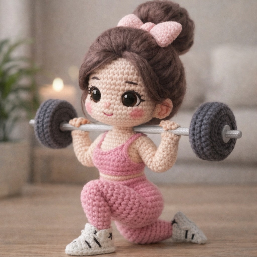 Amigurumi Fitness Girl Pattern GuideAmigurumi Fitness Girl Pattern Guide Materials Needed Yarn: Cotton or cotton-blend yarn in Skin Color, Pink (outfit), Brown (hair), Grey (weights), and White (shoes). Hook: 2.0mm or 2.5mm (to keep stitches tight). Safety Eyes: 10mm or 12mm black eyes. Fiberfill: For stuffing. Wire/Pipe Cleaner: For the barbell and potentially for neck support. Blush: For the cheeks. 1. The Head (Skin Color) The head is a classic round amigurumi shape. R1: 6 sc in Magic Ring (MR). R2: 6 inc (12). R3: (1 sc, inc) x6 (18). R4-R10: Continue increasing until you reach 48 or 54 stitches. R11-20: Work even (sc in each stitch) to create the height. Eyes: Place safety eyes between R16-R17, about 8-10 stitches apart. R21-End: Decrease (dec) gradually until you have 12-18 stitches left. Stuff firmly.2. The Body & Legs (Pink and Skin Color) This doll is worked from the bottom up (starting with shoes/legs). Shoes: Start with white. Create an oval base, then work up to form the sneaker shape. Legs: Switch to Pink. Work in rounds. For the "lunging" pose in the photo, you will need to wire the legs so they are flexible. Body: Join the legs together with a chain. Continue in Pink for the leggings, switch to Skin Color for the midriff, then back to Pink for the sports bra. Shoulders: Decrease sharply at the top to form the neck. 3. The Hair (Brown) The hair is textured. To get the "bun" look: Hair Cap: Make a simple cap in brown that fits the head. The Bun: Make a large stuffed sphere (separate) and sew it to the top of the hair cap. Front Strands: Use "surface crochet" or long chain loops to create the textured lines seen on the top of the head.