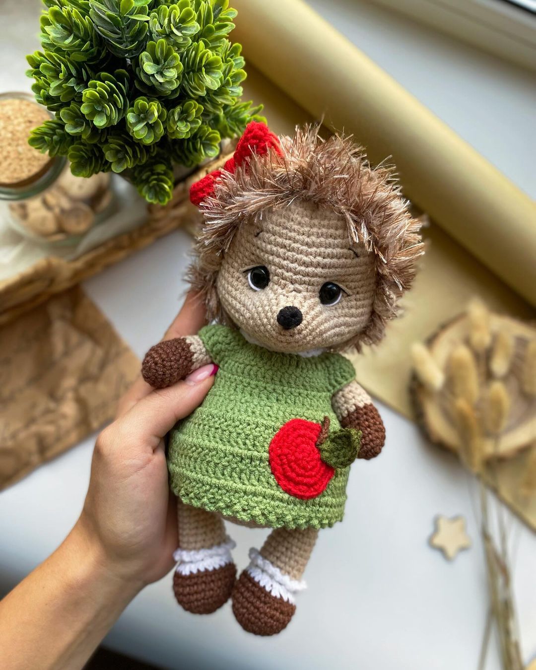 Spout: 1. 6 sc into magic ring (insert the spout on a secure mount into the hole, then tighten it) 2. (1 sc, inc) *3 (9) 3. (2 sc, inc) *3 (12) 4. (3 sc, inc) *3 (15) 5. (4 sc, inc) *3 (18) Lightly stuff the nose and sew to the head between 36 and 42 rows. Ears (2 parts): 1. 6 sc into magic ring, turn 2. 1 ch lift, 6 inc (12) Sew the ears to the head between 39 and 43 rows. Needles (in the process we try on): Yarn weed we collect 2 ch and connect into a ring sl-st. (since the yarn is textured, we use a marker when knitting) 1. 6 sc in a ring of ch 2.6 inc (12) 3. (1 sc, inc) *6 (18) 4. (2 sc, inc) *6 (24) 5. (3 sc, inc) *6 (30) 6. (4 sc, inc) *6 (36) 7. (5 sc, inc) *6 (42) 8. (6 sc, inc) *6 (48) 9. (7 sc, inc) *6 (54) At this stage, we try on a shaggy wig on the head, if necessary, then knit another row with increments, or vice versa – dissolve the row. It should not hang out, but it should not be very tight either.Then we knit without increments: 10-14. 54 sc (5 rows) Adjust the number of rows yourself, the wig should be close to the ears. Next, with needles, we mark a checkmark on the muzzle. And guided by the marks, we knit in turning rows, without a lifting loop, skipping the first loops: (I got 11 sc between the needles, yours may differ) 1. Turn, skip the first loop, 11sc. 2. Turn, skip 1 p, 9 sc. 3. Turn, skip 1 p, 7 sc. 4. Turn, skip 1 p, 5 sc. n. 5. Turn, skip 1 p, 3 sc. 6. Turn, skip 1 p, 1 sc. If necessary, knit a few more sc back and forth. We finish knitting, leave a long thread, cm 40. It is needed in order to make needles with fronts. We comb the wig with a comb. We pin it to the head with needles and sew it on. We insert the long end of the grass into the needle, insert it into the head and bring it out under the ear, lay the thread in front of the ear and insert it above it, bring it out under the other ear, in the same way we lay the thread in front and put it over the ear. We fix it, hide the tip inside. We straighten the needles that I received. We trim the grass a little on the muzzle, giving it a shape. We make out the muzzle, guided by the photo, blush the cheeks. Pants (trying on in the process): We collect a chain of 37 ch, connect it into a ring. We knit rows with a lifting loop (the lifting loop counts as the first sc) 1-6. 1 ch, 37 sc, sl-st, (6 rows) Fasten the thread, cut. Similarly, we knit the second leg, fasten and cut the thread in the same way. Hide protruding threads. Place both pieces together seam to seam and work 6sc over both legs. We should get 31sc on each leg. We continue knitting:7. 1 ch, 31 sc on one leg + 31 sc on the other, sl-st (62) 8-9. 1 ch, 62 sc, sl-st (2 rows) 10. 1 ch, 14 sc, dec, 30 sc, dec, 14 sc, sl-st (60) 11. 1 ch, (8 sc, dec) *6, sl-st (54) 12. 1ch, 54 sc, sl-st 13. 1 ch, (7 sc, dec) *6, sl-st (48) Head brush knitting, fasten and cut the thread. We count from the back of the seam on each side along 18 sc and mark the middle with markers (between the markers 12 sc). 1. 1 ch, 12 sc, turn 2. 11 sc, turn 3. 10 sc, turn 4. 9 sc, turn 5.8 sc. We knit on the side of 4 sc, remove the marker, knit 12 sc. We knit the strap – 21 ch, from the second loop from the hook we knit 20 sc, 1 sl-st into the loop from which the webbing was knitted. 12 sc, similarly we knit the second strap, 12 sc, on the side 4 sc, sl-st. We sew the straps in front, at the same time we sew on the buttons.