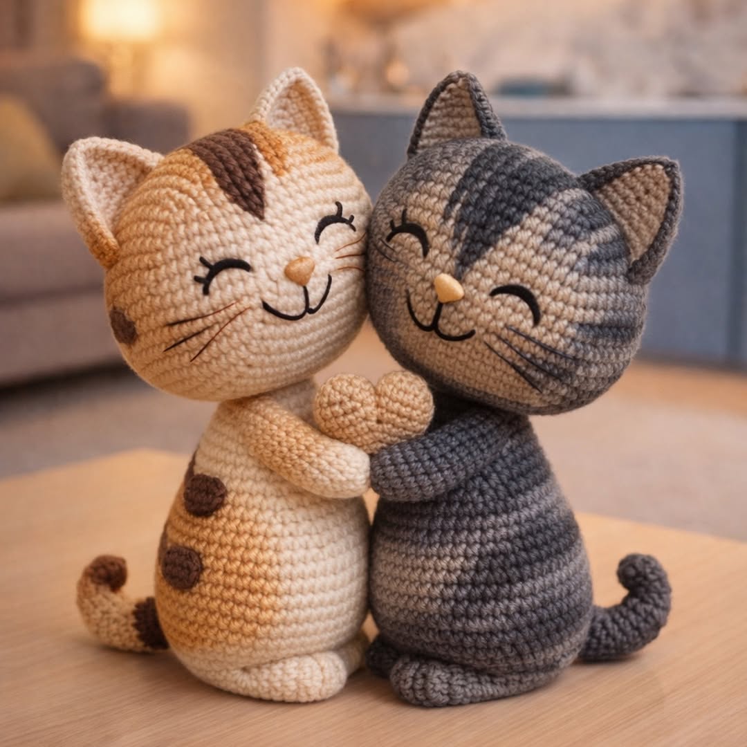 4. Arms and Tail Arms (Make 4): R1: 6 sc in MR (6) R2-10: 6 sc. Stuff lightly. Tail (Make 2): R1: 6 sc in MR (6) R2-15: 6 sc. Optional: Insert a wire for posing. 5. Assembly & Materials Materials: Use Cotton Blend yarn (like Alize Cotton Gold) and a 2.0 mm - 2.5 mm hook for a tight stitch. You will also need fiberfill, a yarn needle, and stitch markers. Face Details: Use black embroidery thread for "U" shaped closed eyes and a mouth. Embroider a small pink triangle for the nose. Assembly: Sew the head to the body. Attach the ears symmetrically between rounds 4 and 9. Hugging Position: Place the cats side-by-side. Sew the inner arms as if they are holding a heart. You can crochet a small heart or cut one from felt to place between them. Tip for Stripes: Change to a darker color for 5-6 stitches every 3-4 rounds to create a tabby effect.