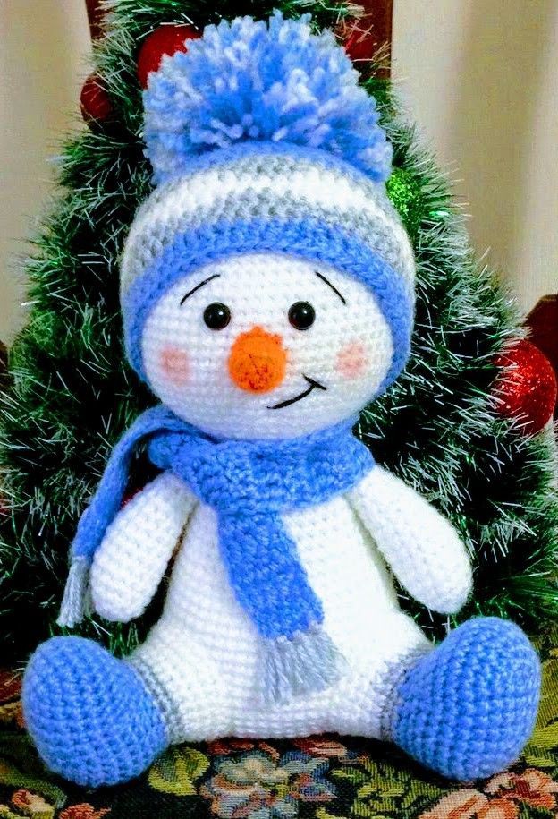 Nose 1.6 Ka 2.6 PRS 3. (PRS, D) * 2-8 4.8 PRS 5. (PRS, D) * 4-12 6-7.12 PRS 8. (2SBN, D) * 4-16 A little to beat and sew to a head, to embroider a mouth and eyebrows. Body 8 W. p + 1 Loop 1.3 prs. In 2nd loop from the hook, 6 PRS, 3 PRS in one, turn knitting, 6 PRs on the other side-18 2.3 Ave,6 PRS, 3 D, 6 PRS-24 3. (PRS, D) * 3, 6 PRS, (PRS, D) * 3, 6 PRS-30 4. (2 PRS, D) * 3, 6 PRS, (2 PRS, D) * 3, 6 PRS-36 5. (3 PRS, D) * 3, 6 PRS, (3 PRS, D) * 3, 6 PRS-42 6. (4 PRS, D) * 3, 6 PRS, (4 PRS, D) * 3, 6 PRS-48 7.48 PRS 8. (5 PRS, D) * 3, 6 PRS, (5 PRS, D) * 3, 6 PRS-54 9-15.54 PRS 16. (7SBN, UB) * 6-48 17-18.48 PRS 19. (6SBN, UB) * 6-42 20-21.42 PRS 22. (5SBN, UB) * 6-36 23.36 PRS 24. (4SBN, UB) * 6-30 25.30 PRS 26. (3SBN, UB) * 6-24 27.24 PRS 28. (2SBN, UB) * 6-18 Fill the filler and sew the body to the headLegs 2 pcs (start red) 5. P + 1 1.3 PRs in the second n from a hook,3 PRS, 3 prs in a trace. P, turn, 3 PRS-12 2.3 Ave,3 PRS, 3 D, 3 PRS-18 3. (PRS, D) * 3, 3 PRS, (PRS, D) * 3, 3 PRS-24 4. (2 PRS, D) * 3, 3 PRS, (2 PRS, D) * 3, 3 PRS-30 5. (3 PRS, D) * 3, 3 PRS, (3 PRS, D) * 3, 3 PRS-36 6-7.36 PRS 8. (7 PRS, UB) * 4-32 9.15 PRs, (UB, PRS) * 5, UB-26 10.5 PRS, UB, 2 PRS, UB, 3 PRS, 6 UB-18 11.18 PRS Changing to Green 12.18 PRS 13. (2 PRS, D) * 6-24 Changing to white color 14.24 PRS 15. (3 PRS, D) * 6-30 16.30 PRS Fill the leg with the filling and sew to the body