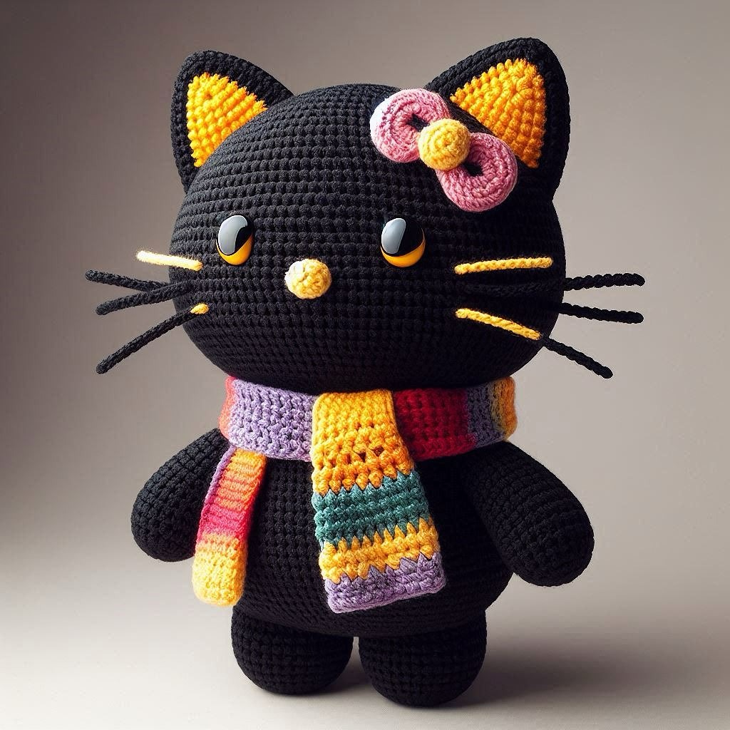 Black Cat Amigurumi Crochet PatternMaterials: Black, pink, and white worsted weight yarn Crochet hook size 3.5mm Polyester stuffing 6mm safety eyes Small bell and thread Tapestry needle Scissors Stitch marker Instructions: Head: With black yarn, start with a magic ring. Round 1: 6 single crochets into the magic ring. (6) Round 2: 2 single crochets in each stitch around. (12) Round 3: (1 single crochet, 2 single crochets in next stitch) around. (18) Continue increasing evenly until you reach 36 stitches. Work even for 5 rounds to form the round shape of the head. Attach safety eyes between rounds 6 and 7. Embroider the nose and whisker spots with pink and white yarn. Stuff the head firmly and close off. Body: Begin with a magic ring and black yarn. Work in continuous rounds, increasing evenly to form a ball shape, stopping at 24 stitches around. Work 6 rounds even, then begin decreasing. Stuff the body and close off, leaving a small opening to attach the head later. Ears (make 2): With black yarn, create a small triangle by crocheting a magic ring with 6 stitches. Work 3 rounds, increasing every 2nd round. Attach ears to the top of the head. Arms and Legs (make 4): Work in continuous rounds starting with a magic ring and 6 stitches. Work 5 rounds even, stuffing lightly. Sew arms and legs onto the body. Tail: Make a long tube by starting with a magic ring of 6 stitches. Work in continuous rounds until desired length (about 5 inches). Attach to the lower back of the body.Finishing Touches: Sew the head to the body. Attach a small bell around the cat’s neck with a thread or small string. Add any final adjustments to facial features with embroidery thread for added charm.