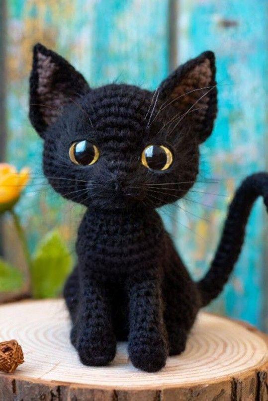 Black Cat Amigurumi Crochet Pattern Materials: Black, pink, and white worsted weight yarn Crochet hook size 3.5mm Polyester stuffing 6mm safety eyes Small bell and thread Tapestry needle Scissors Stitch marker Instructions: Head: With black yarn, start with a magic ring. Round 1: 6 single crochets into the magic ring. (6) Round 2: 2 single crochets in each stitch around. (12) Round 3: (1 single crochet, 2 single crochets in next stitch) around. (18) Continue increasing evenly until you reach 36 stitches. Work even for 5 rounds to form the round shape of the head. Attach safety eyes between rounds 6 and 7. Embroider the nose and whisker spots with pink and white yarn. Stuff the head firmly and close off. Body: Begin with a magic ring and black yarn. Work in continuous rounds, increasing evenly to form a ball shape, stopping at 24 stitches around. Work 6 rounds even, then begin decreasing. Stuff the body and close off, leaving a small opening to attach the head later.