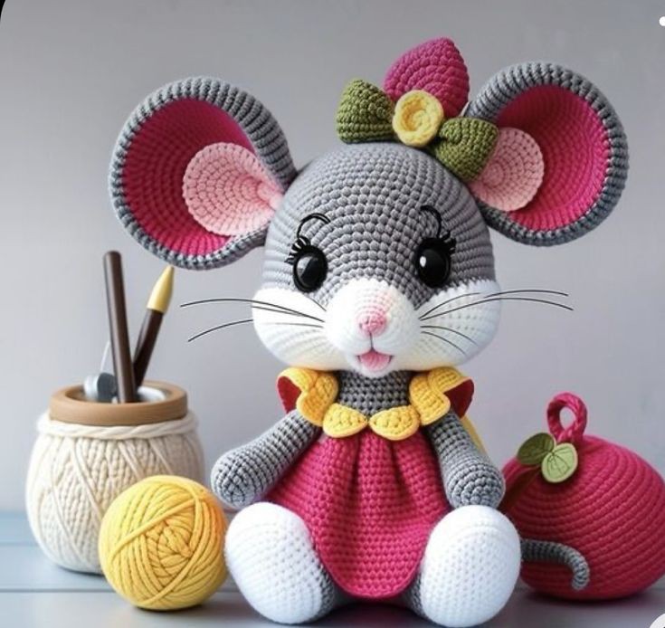 Crochet Mouse Girl Amigurumi Pattern Materials: Yarn: Light worsted weight yarn in light pink, dark pink, black, white, gray Crochet hook: 3.5mm crochet hook Other: Polyester stuffing 9mm black safety eyes Yarn needle Stitch markers (optional) Pink embroidery floss Small pink ribbon (optional. Step by step Pattern Body: Start with the light pink yarn and make a magic ring. Work 6 single crochets (sc) into the ring. Increase in each stitch around (12 sc). Place a stitch marker to mark the beginning of the round. Continue working in rounds of sc, increasing in every other stitch until you have 36 sc. Work without increasing until the body reaches the desired length. Finish off and weave in the ends.