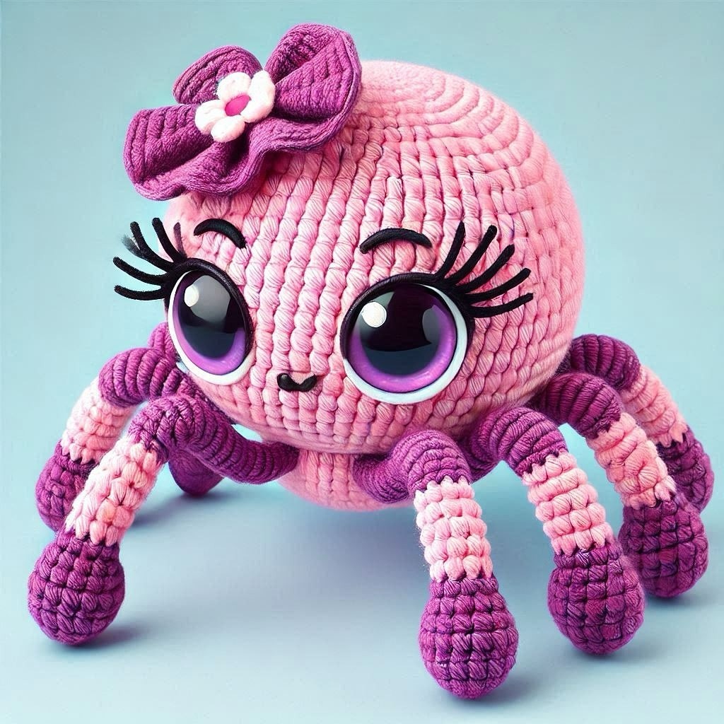 Legs 7 and 8. Slate grey colour. 1. 6 sc into a double magic loop = 6 2. (1 sc, inc, 1 sc)*2 = 8 3-8. 8 sc8 (6 rows) Fasten off. Sew the legs.Bow:Embroider eyebrows and mouth using black colour. Sew the bow.