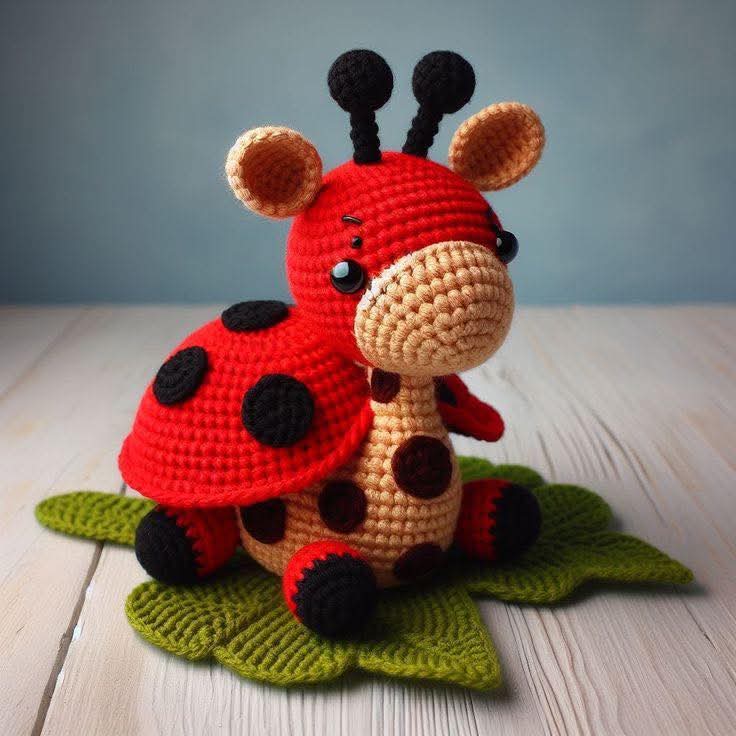 Materials: Yarn: Fine (4 ply) semi-cotton yarn in your main color (MC) for the body and head (yellow and beige in the image) Small amounts of contrasting colors for the spots, nose, and horns (brown and black in the image) Hook: 2.0 mm crochet hook Safety eyes: 8mm (black in the image) Stuffing: Polyester fiberfill Embroidery needle: Tapestry needle Other: Stitch marker, scissorsStep by step Pattern Body: Start with MC, make a magic ring, and work 6 sc into the ring. Sc in each st around (6 sts). Inc in each st around (12 sts). [Sc in next st, inc in next st] Repeat (18 sts). Continue increasing every other st until you have 24-30 sts, depending on your desired size. Work 4-6 rounds without increasing. Place a marker and work half the number of stitches you have on the body (e.g., if you have 30 sts, work 15 sts), stuff the body firmly, work the remaining stitches, and join with sl st to marker. Continue working rounds without stuffing, decreasing evenly until you have 6 sts remaining. Cut yarn, leaving a long tail, pull yarn through remaining sts, and tighten to close. Weave in ends. Head:Make a magic ring with MC and work 6 sc into the ring. Sc in each st around (6 sts). Inc in each st around (12 sts). Work 4-6 rounds without increasing. Stuff the head firmly. Decrease evenly until you have 6 sts remaining. Cut yarn, leaving a long tail, pull yarn through remaining sts, and tighten to close. Weave in ends.