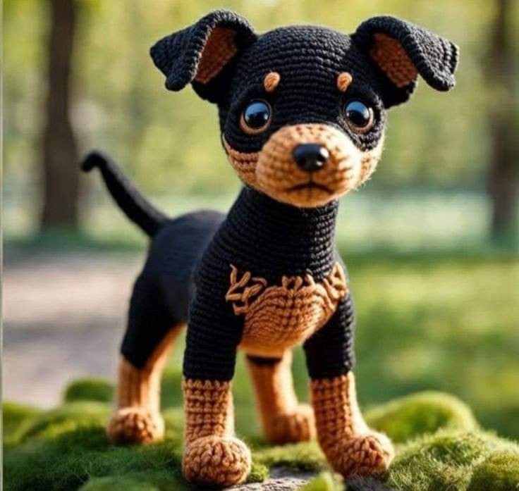 35 Row: 8 blk. sc, 4 brwn. sc, 12 blk. sc = 24 sc 36-40 Row: 9 blk. sc, 4 brwn. sc, 11 blk. sc = 24 sc (5 rows) 41-42 Row: 10 blk. sc, 3 brwn. sc, 11 blk. sc = 24 sc (2 rows) 43 Row: (2 sc, dec) * 6 = 18 sc 44 Row: (1 sc, dec) * 6 = 12 sc 45 Row: 6 dec and close the opening. Legs Start with brown color. 1 Row: 6 sc in CA 2 Row: 6 inc = 12 sc 3 Row: (1 sc, inc) = 18 sc 4-5 Row: 18 sc (2 rows) 6 Row: 6 dec, 6 sc = 12 sc 7 Row: 3 dec, 6 sc = 9 sc 8 Row: 9 sc. At the end, change to black. 9-13 Row: 9 blk. sc (5 rows) 14 Row: (1 blk. sc, dec) * 3 = 6 sc Stuff the tip of the leg a bit more densely, not too much on top. Fold the leg in half and crochet the halves together with single crochets. Using a thin, strong thread in the same color, create toe indentations on top, forming the toes. Embroider claws with black yarn. Tail 1 Row: 4 sc in CA 2-13 Row: 4 sc (12 rows), ss. Secure the thread, leaving a tail for sewing. Finishing and Assembly First, sew the ears to the head using a thin, strong black thread. Use the photo as a reference for their placement. Above the eyes, after every 2 rows, embroider eyebrows in brown color. Sew the head to the body using a strong thread, making sure that the brown color of the face aligns approximately with the brown color on the chest. Attach the front legs tightly to the body with strong black thread, approximately under the ears. They should be immovable. Attach the hind legs at the very end of the body. Attach the tail in the same area where you closed the body.