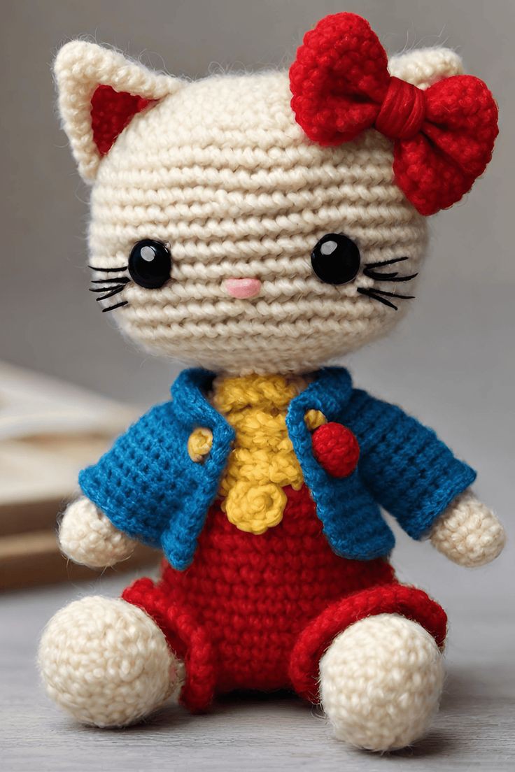 Materials • Yarn, ı use 8/4 100% cotton (50g/170 m, superfine) in three colors white for main body and light pink and dark pink. • 2 mm crochet hook • 6 mm safety eyes • Scissors • Needle • Pins • Fiberfill Abbreviations Row– row AM– Magic ring Sc– single crochet Inc– increase Dim– decrease Slst– slip stitch Pa– double crochet Ch– chainHead Row 1: 6sc in MR (6) Row 2: *inc x6 (12) Row 3: *1inc, inc* x6 (18) Row 4: *2inc, inc x6 (24) Row 5: *3inc, inc x6 (30) Row 6: *4inc, inc x6 (36) Row 7: *5inc, inc x6 (42) Row 8-13: 5 rounds with sc (42) Attach the eyes between Row 9-10 6st apart. Row 14: *5sc, decx6 (36) Row 15: *4sc, decx6 (30) Row 16: *3sc, decx6 (24) Start stuffing the head firmly. Row 17: 2sc, decx6 (18) Stuff a little more if needed when finished. Row 18: 1sc, dec (12) Finish with a sl st and fasten off.Legs (Make 2) Row 1. 6 sc in MR (6) Row 2. *inc, x6 (12) Row 3-8. 5 rounds with sc (12) First legs: at the end of the last row make 1 sl st, 1 chain, cut the yarn and tuck it in. Second legs: do not cut the yarn, continue crocheting and make 6 sc and join with the other leg piece.Leave a long thread to sew the head to the body. Ears (Make 2) Row 1. 6 sc in AM Row 2. *1sc, inc x3 (9) Row 3. *1sc, inc x3 (12)Finish with a sl st and leave a long strand of yarn to sew to the head later. Arms (Make 2) Row 1. 6 sc in MR (6) Row 2-5. 4 rounds sc in each row At the end of the last row make 1 sl st, 1 chain, cut the yarn and fasten it inside.Body Row 9. 12 sc in the second leg and join to the first leg making 6 sc (24)Change the pink thread and cut the white thread.Row 10-11. 2 rows sc in each st (24)Row 13-14. 2 rows sc in each st (24)Row 15. *2sc, dec x6 (18) Row 15. *1sc, dec x6 (12)Making the Skirt Row 1. chain 2, dc in each stitch across the entire round and end with sl st. Row 2. ch 2, sl st, and repeat across the entire final round with sl st and weave in ends.Now embroider the lips, insert the needle one point below the eyes and embroider the lips in two pointsHow it looks after embroidering the lips.Take the bow tie and glue it with a glue gun.Make 3 lines on both sides for the whiskers on both sides.Bow Tie for Head AM: chain 3, triple crochet twice, chain 3 slst, chain 3 again and repeat the same.Pin the ears 3 points from the head and sew them on.Pin the hands exactly where you sewed the head and sew them on.