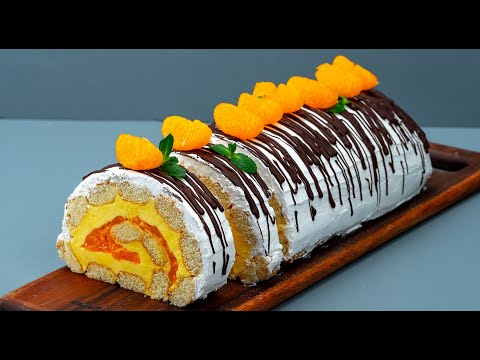 I haven't bought a cake for 3 years! This no baking roulade is fantastic Ingredients: milk - 200 ml (6.76 fl oz) sponge fingers - 300 g (10.6 oz) for the cream: eggs - 2 pieces sugar - 100 g (3.5 oz) milk - 500 ml (16.9 fl oz) starch - 60 g (2 oz) canned tangerines - 200 g (7 oz) IN THE FRIDGE 1 H whipped cream - 200 ml (6.76 fl oz) dark chocolate - 50 g (1.76 oz) tangerines - 100 g (3.5 oz) mint - 10 g (0.35 oz) Follow us on: Facebook: https://www.facebook.com/Cookrate.ENG/