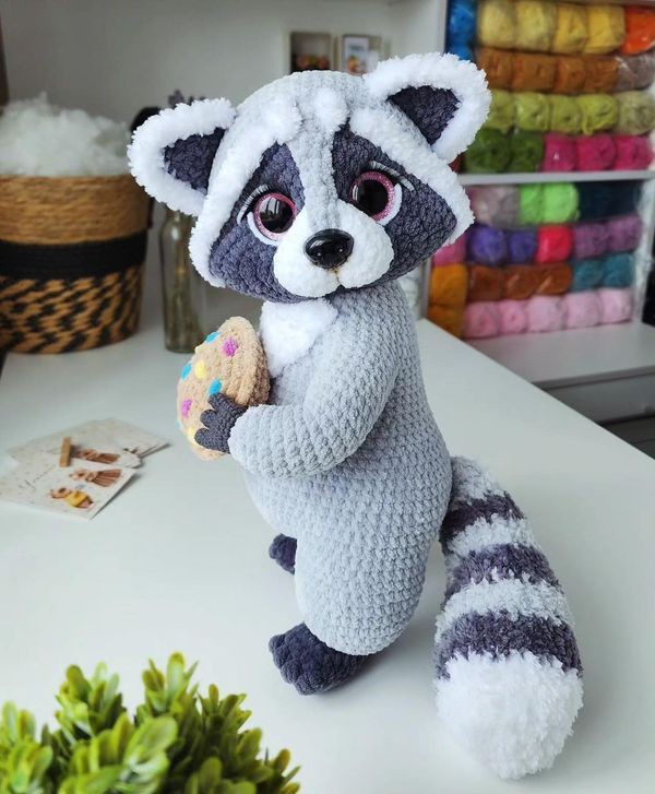 Rnd 19: sc even (18) Rnd 20: (1 sc, 1 sc dec) rep around (12) Rnd 21: switch to gray yarn, sc even (12) Rnd 22: sc even (12) Rnd 23: (4 sc, 1 sc dec) rep twice (10) Rnd 24 - 26: sc even (10) F/O and leave a long strand of yarn. Stuff the tail firmly. JACKET (yellow yarn; 3.25 mm hook; work in rows) Rnd 1: 25 chs, 1 sc in the 2nd ch from the hook, 23 sc (24); ch 2 and turn Rnd 2: (2 dc, 1 dc inc) rep around (32); ch 1 and turn Rnd 3: sc even (32); ch 2 and turn Rnd 4: 4 dc, 4 chs, skip 4 sts and work 1 dc into the next st, 15 dc, 4 chs, skip 4 sts and work, 1 dc into the next st, 3 dc (32); ch 1 and turn Rnd 5: (3 sc, 1 sc inc) rep around (40); ch 2 and turn Rnd 6: dc even (40); ch 1 and turn Rnd 7: (4 sc, 1 sc inc) rep around (48); ch 2 and turn Rnd 8: dc even (48) Do not cut the yarn, sc around instead (make 3 sc on each corner). F/O, cut and hide the yarn. Assembling Instructions: Place and secure the jacket onto the body with pins, so that you locate the spots where to attach the arm to. Mark the spots with few pins. Sew the arms to the side of the body. For your reference, I attached the arms between rnds # 32-38. Sew the legs to the bottom of the body between rnds # 46-50. Sew the tail to the back of the body between rnds # 45-50. Create the belly button embroidering an X with black cotton thread on the body.
