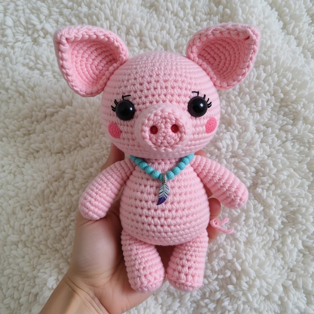 Step by step Pattern Body: Start with pink yarn and make 6 sc in a magic ring. Increase to 12 sc (2 sc in each sc). Continue crocheting in rounds, increasing by 6 sc evenly each round until you have 36 sc. Stuff the body lightly with stuffing. Crochet without increasing until the body reaches the desired size. Decrease by crocheting 2 sc together in each sc. Continue decreasing until you have 6 sc. Cut the yarn, leaving a long tail for sewing. Sew the hole closed.Head:With pink yarn, make 6 sc in a magic ring. Increase to 12 sc (2 sc in each sc). Continue crocheting in rounds, increasing by 6 sc evenly each round until you have 24 sc. Stuff the head lightly with stuffing. Crochet without increasing until the head reaches the desired size. Decrease by crocheting 2 sc together in each sc. Continue decreasing until you have 6 sc. Cut the yarn, leaving a long tail for sewing. Sew the hole closed.