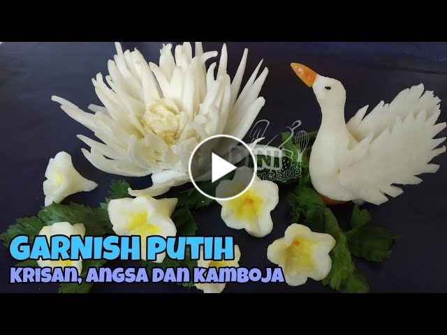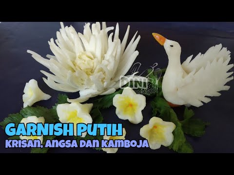 Garnish bunga krisan, kamboja dan angsa cantik, semuanya dalam nuansa putih. Sangat cantik untuk hiasan nasi kuning/warna.Simak videonya, kalo kurang jelas, silakan tulis di komen.