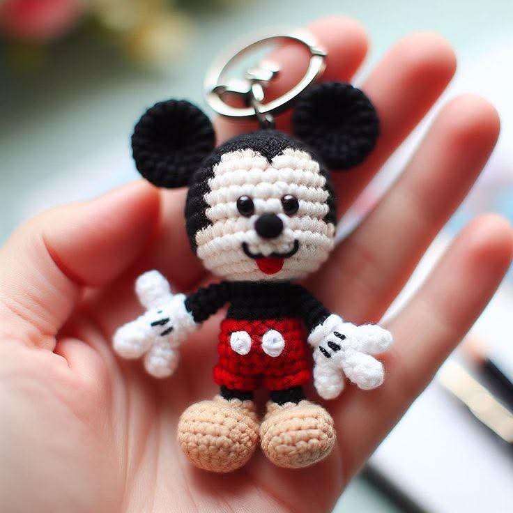 Shorts: Using orange yarn, ch 16, join with a sl st to form a ring. (16) Sc in each st around. (16) 3-5. Sc in each st around. (16) Fasten off, leaving a long tail for sewing. Eyes and Nose: Using white yarn, embroider small eyes on the head. Use black yarn to create a small nose in the middle. Attach safety eyes above the embroidered eyes for a cute look. Cheeks: Using pink yarn, embroider small circles on each side of the face to create blush. Assembly: Sew the ears to the top of the head. Attach the arms to the sides of the body. Sew the legs to the bottom of the body. Attach the head to the body. Sew the shorts onto the lower part of the body. Attach the keychain ring to the top of the head. Weave in all loose ends and trim any excess yarn.