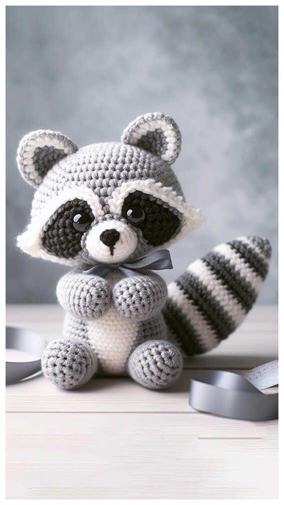 Raccoon Amigurumi Crochet Pattern Materials To create this adorable raccoon amigurumi, you will need: Yarn: Grey yarn for the body White yarn for the belly Black yarn for the mask, ears, and stripes on the tail Crochet Hook: Size appropriate for your yarn (commonly 2.5mm or 3.0mm for amigurumi) Safety Eyes: 8mm black safety eyes Stuffing: Polyester fiberfill Tapestry Needle: For sewing parts together Scissors Instructions Head and Body: Head: With grey yarn, make a magic ring. Round 1: 6 sc in the magic ring. (6) Round 2: 2 sc in each stitch around. (12) Round 3: Sc in next stitch, 2 sc in next stitch repeat around. (18) Round 4: Sc in next 2 stitches, 2 sc in next stitch repeat around. (24) Round 5: Sc in next 3 stitches, 2 sc in next stitch repeat around. (30) Rounds 6-10: Sc in each stitch around. (30) Insert safety eyes between rounds 7 and 8, about 8 stitches apart. Round 11: Sc in next 3 stitches, sc2tog repeat around. (24) Round 12: Sc in next 2 stitches, sc2tog repeat around. (18) Round 13: Sc in next stitch, sc2tog repeat around. (12) Round 14: Sc2tog around. (6) Fasten off and leave a long tail for sewing.